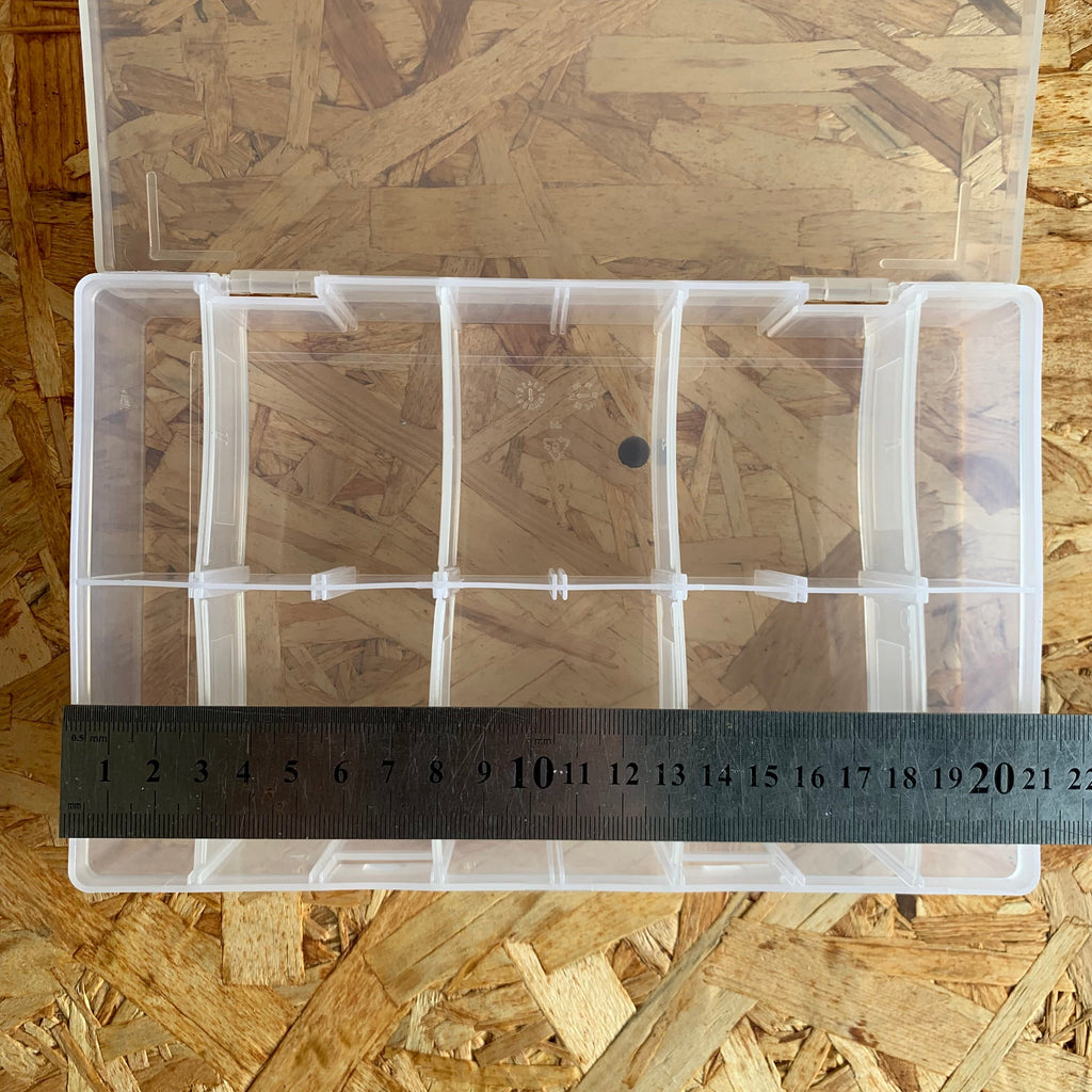 This plastic storage box is ideal for organising and safely storing small items. It is a secure sturdy box with a hinged lid and it contains 8 dividers to help keep the contents separated.